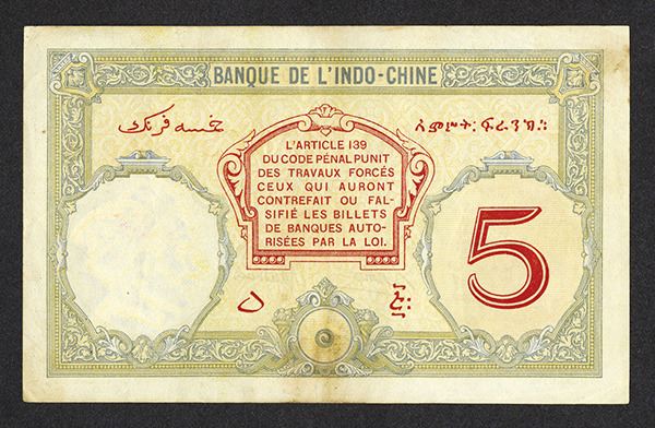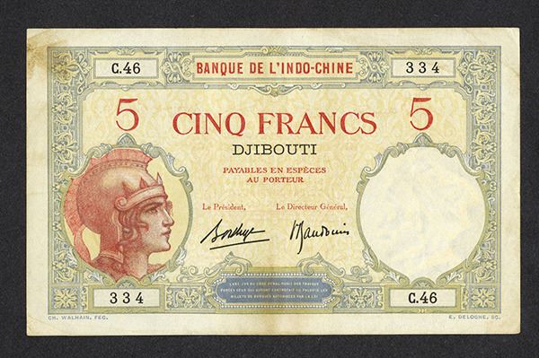 French Somaliland. 5 Francs. P-6b. Helmeted female head at lower left. Nice Very Fine, light paper tone.