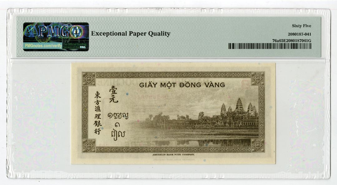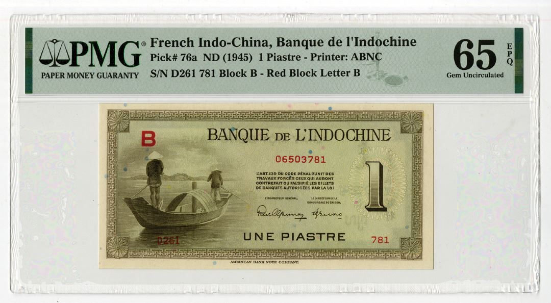French Indo-China. ND (1945). 1 Piastre, P-76a, issued banknote, PMG Graded Gem Uncirculated 65 EPQ, ABNC.