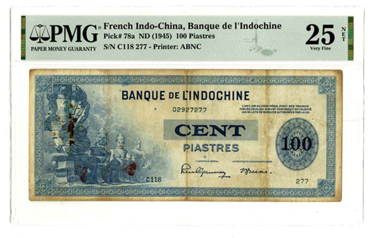 French Indo-China, ND (1945). 100 Piastres, P-78a, Issued banknote, Blue, S/N C118 277, PMG graded Very Fine 25 NET with comments "Rust, Pinholes." Printer: ABNC.