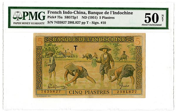 French Indo-China. 5 Piastres, ND (1951), P-75a. Issued banknote, green and multicolor. Face of note shows farmers working in field and reverse shows temple with Buddhists. PMG graded About UNC 50 NET, back with notation "Repaired & Reconstructed." S/N 7435827 298L827 pp T - Sign. #10. (Cert # 5003605-010).