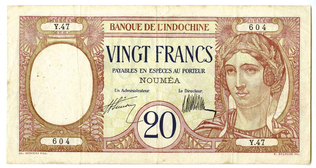 New Caledonia. ND (ca. 1929). 20 Francs, P-37a, issued banknote, Noumea issue, Ch. Fine to VF. (From the Allen Berk Collection)