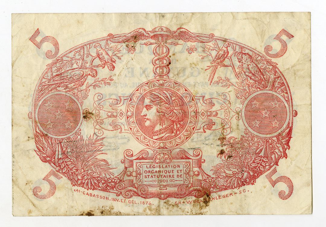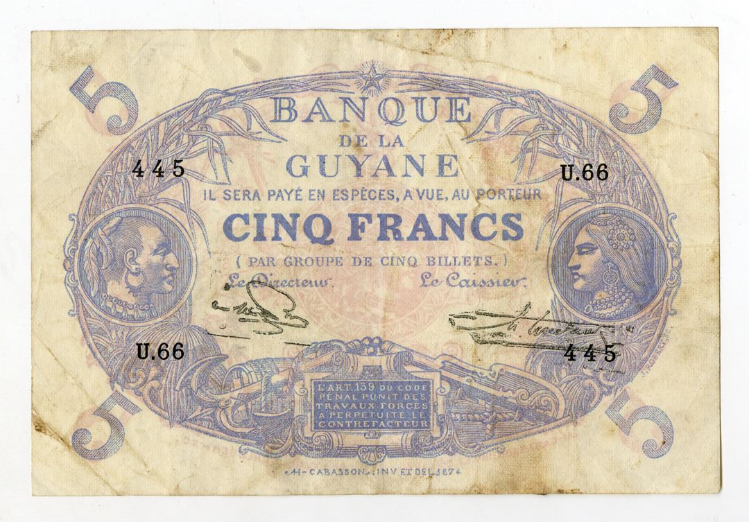 French GuianaÉ.., 1942. 5 Francs, P-1d, Issued Banknote, Blue printing with mans head in medallion at left and womans at right, S/N U.66 445, Good-Fine condition with staining.