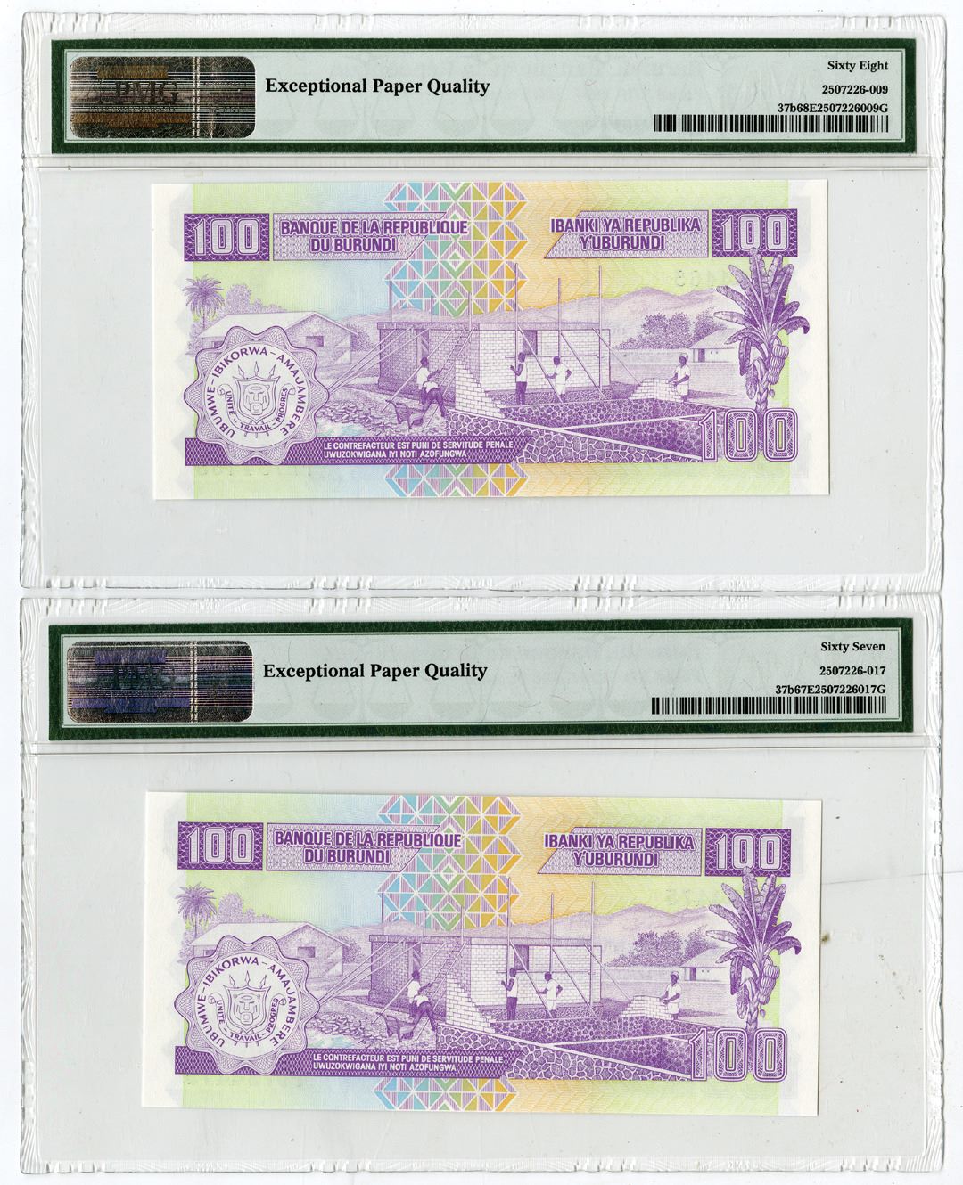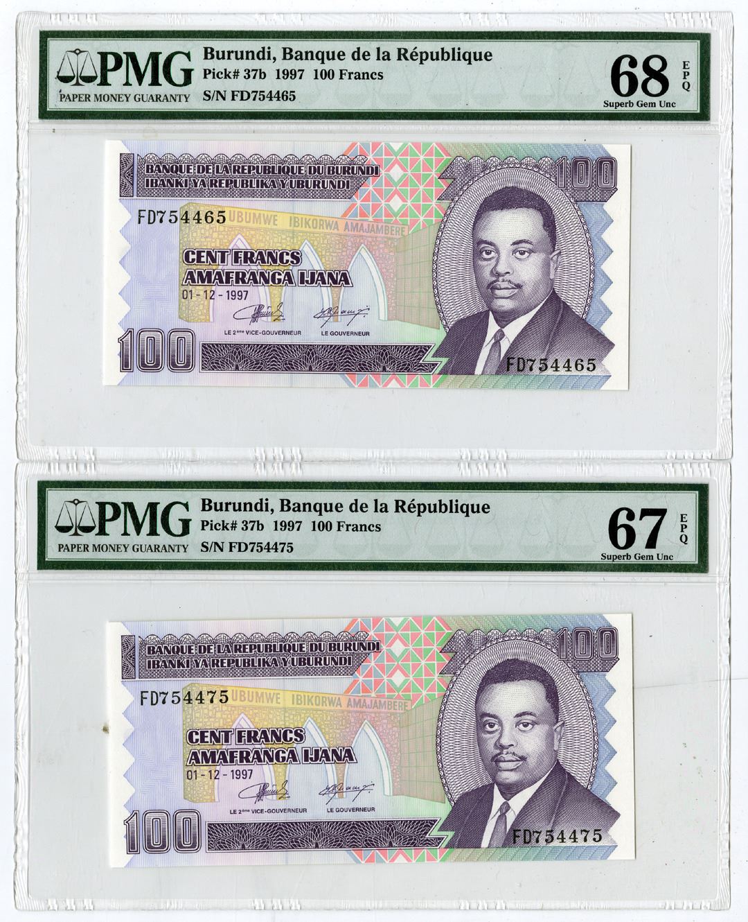 Burundi, 1997. 100 Francs, P-37b (2), Pair of Issued Banknotes, Purple on m/c underprint with portrait of Prince Rwagasor at right, S/Ns FD754465 & FD754475, Both notes are PMG graded, One is Superb Gem Unc 67 EPQ and the other is Superb Gem Unc 68 EPQ. (2). Sold "AS IS" no returns accepted.