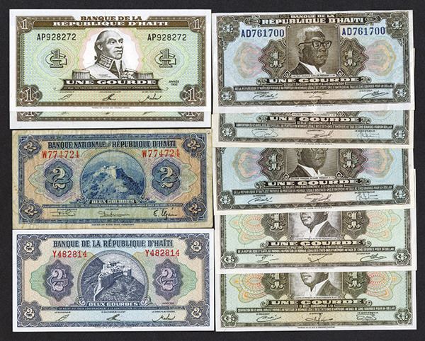 Haiti. 1, 2 Gourdes. Duvalier or Toussaint l'Ouverture at center on most. Many date and signature combinations. Choice Extremely Fine to Choice Uncirculated. One 2 Gourdes is Fine. 9 pieces.
