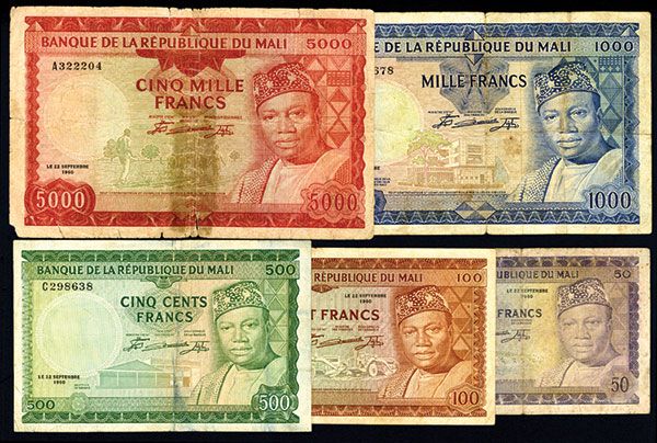 Mali, 1960 (1967), set of 5 notes, includes 50 Francs, P-6, Fine; 100 Francs, P-7, VF; 500 Francs, P-8, nice VF; 1000 Francs, P-9, VF; and 5000 Francs, P-10, nice VG with small tears and tape traces. TDLR.