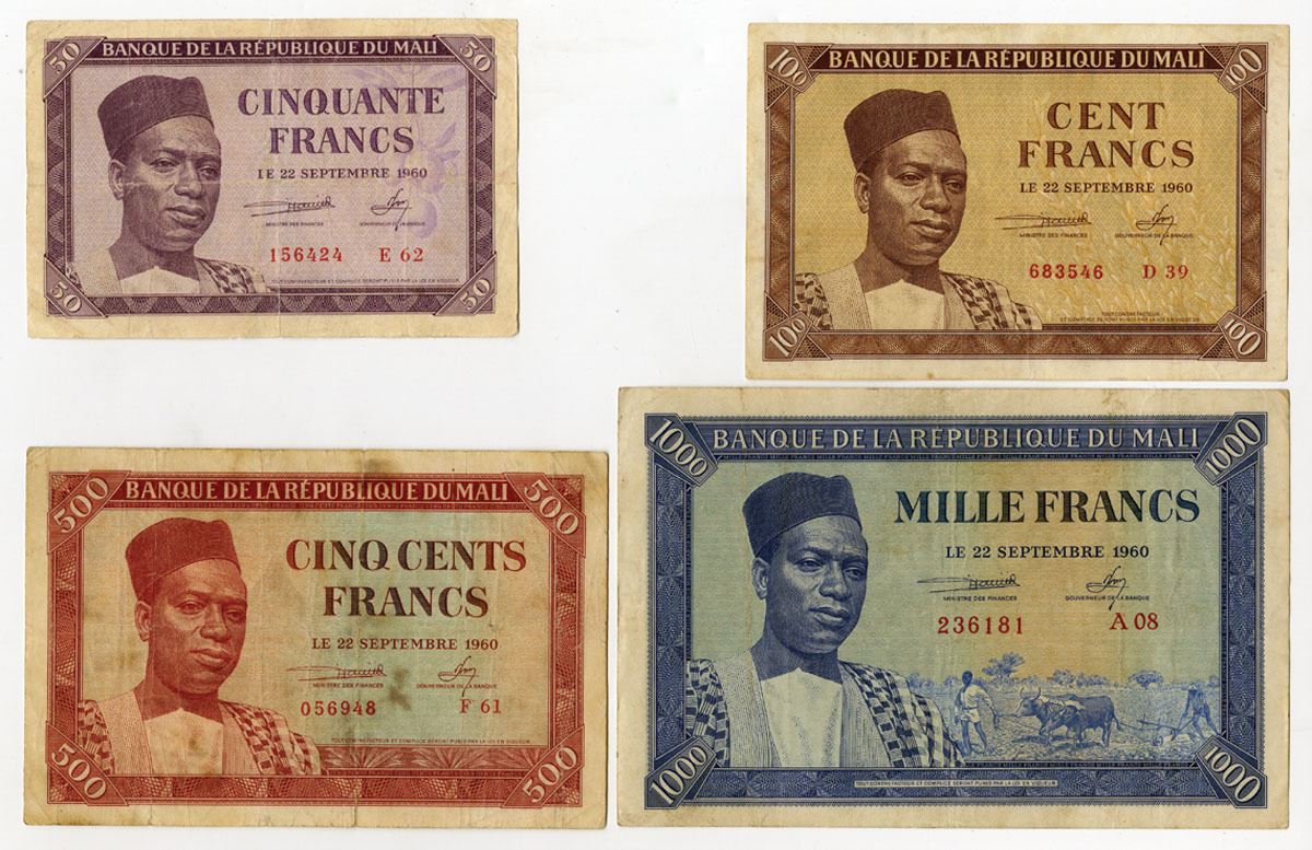 Mali....., 1960. Lot of 4 Issued Banknotes, Includes: 50 Francs, P-1, S/N 156424 E62; 100 Francs, P-2, S/N 683546 D39; 500 Francs, P-3, S/N 056948 F61; 1000 Francs, P-5, S/N 236181 A08. Notes range from Fine to VF condition. (4). Sold "AS IS" no returns accepted.