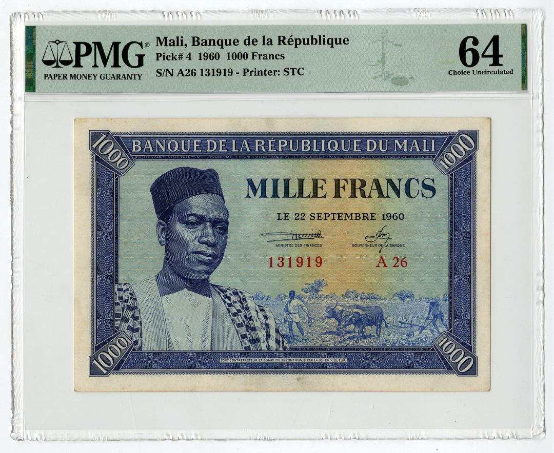 Mali. 1960. 1000 Francs, P-4, issued banknote, Blue on m/c, Man at left with men plowing at right, S/N A26 131919, PMG Graded Choice Uncirculated 64, Printer: STC.