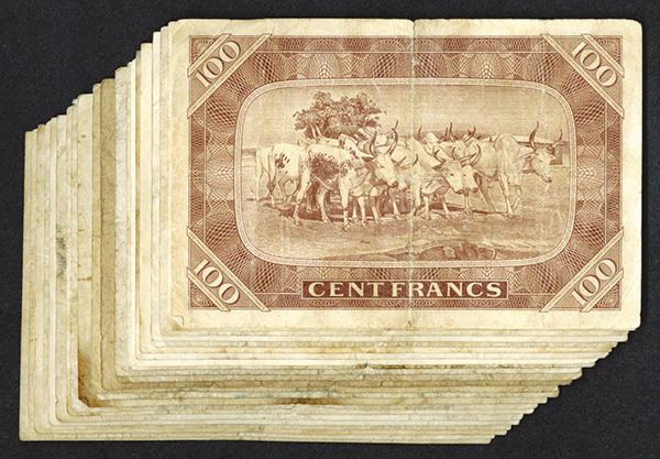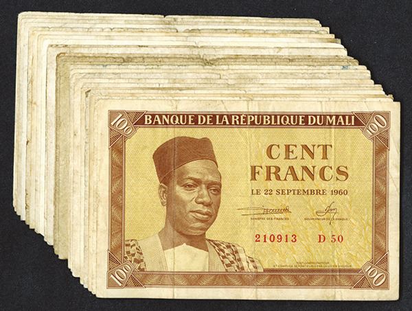 Mali. 100 Francs. Modibo Keita at left, cattle on back. Very Good to Fine or a bit better. 23 pieces.