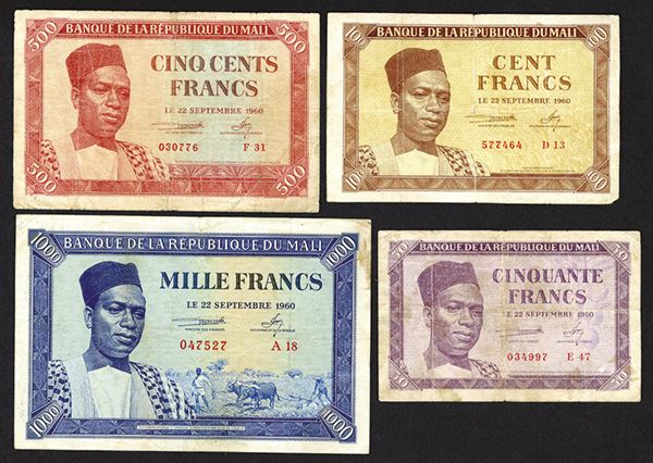Mali, 1960, set of 4 notes, includes 50 Francs, P-1, Fine; 100 Francs, P-2, VF with tiny missing corner on bottom right; 500 Francs, P-3, Choice Fine; and 1000 Francs, P-4, VF. A very attractive lot.