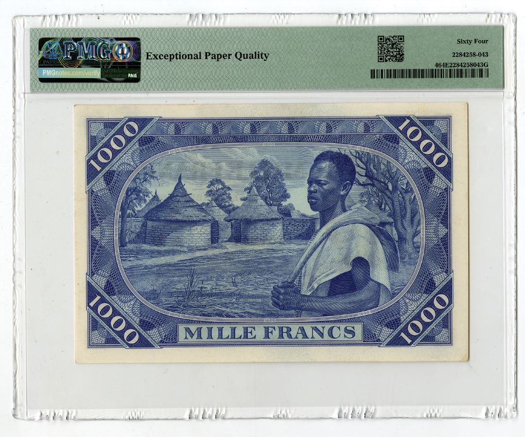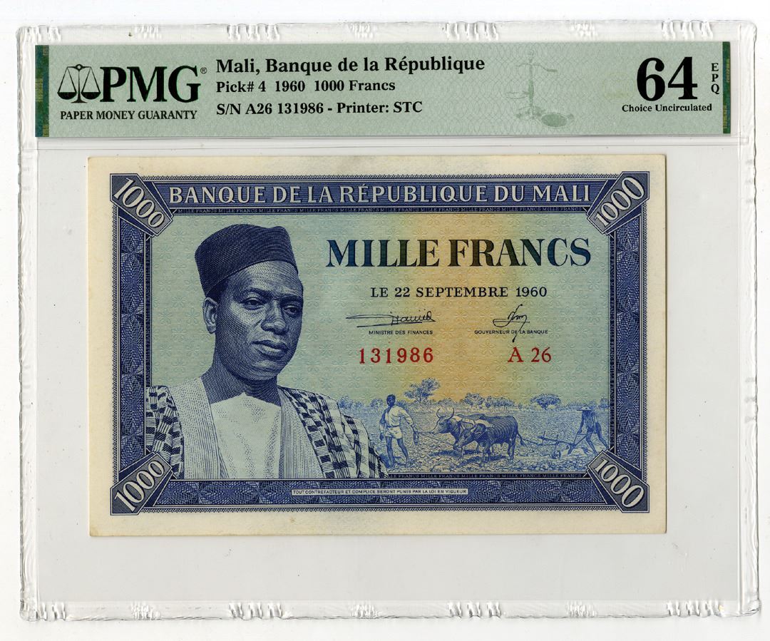 Mali. 1960. 1000 Francs, P-4, issued banknote, Blue on m/c, Man at left with men plowing at right, S/N A26 131986, PMG Graded Choice Uncirculated 64 EPQ, Printer: STC.