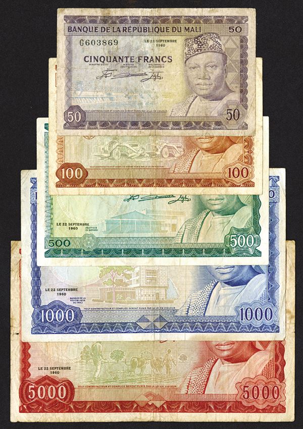 Mali. 50, 100, 500, 1000, 5000 Francs. P-1, 2, 3, 4, 5. One of each denomination. A nice group of circulated issues. Generally Very Good. 5 pieces.