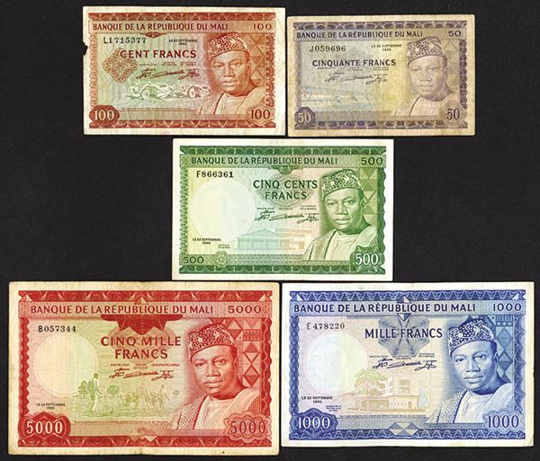 Mali. 50, 100, 500, 1000, 5000 Francs. P-6a, 7a, 8a, 9a, 10a. Modibo Keita at right. Well matched Fine. Some dirty. 5 pieces.