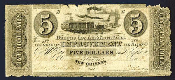 New Orleans, LA, 1836 (?), $5, pp B, Haxby LA-120-G2, Issued banknote, locomotive on top middle, Denominated in Dollars and Piastres, back blank, Choice Good to VG with edge faults, the right corner nibbled and rounded, scarce note. RWH.