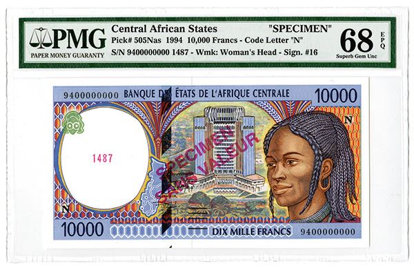 Central African States. 10,000 Francs, 1994, P-505Nas Code letter "N." Specimen banknote, dark brown and blue with blue/black text on m/c underprint. Modern building at center with young woman at right. Back shows fisherman, boats, and villagers along shoreline. Sign. #16. PMG graded Superb Gem UNC 68 EPQ, back with notation "Equatorial Guinea." S/N 9400000000 1487. (Cert # 5003617-018). One of the highest graded examples known and by far the highest example offered at auction in the last 5 years with no records available previous to 2014.