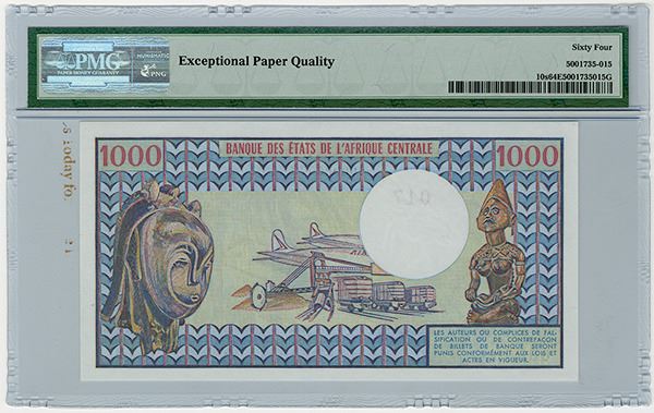Central African Republic. Specimen 1000 Francs, 1980, P-10s. PMG graded Choice Unc 64 EPQ (Cert # 5001735-015). This is the highest graded note in the PMG census out of only 2 graded for this scarce variety.