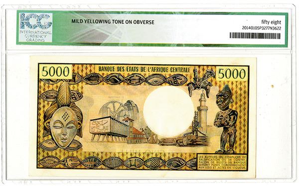 Central African Republic. Issued 5000 Francs, ND (1974), P-3b BEAC B3b. ICG AU+ 58* with comment "Mild yellowing tone on obverse". BdF.