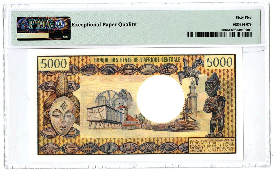 Chad. ND (1978). 5000 Francs, P-5b, Issued banknote, Orange and yellow multicolor, S/N O.2 04994, Watermark: Antelope's Head - Sign. #9, PMG graded Gem Uncirculated 65 EPQ.