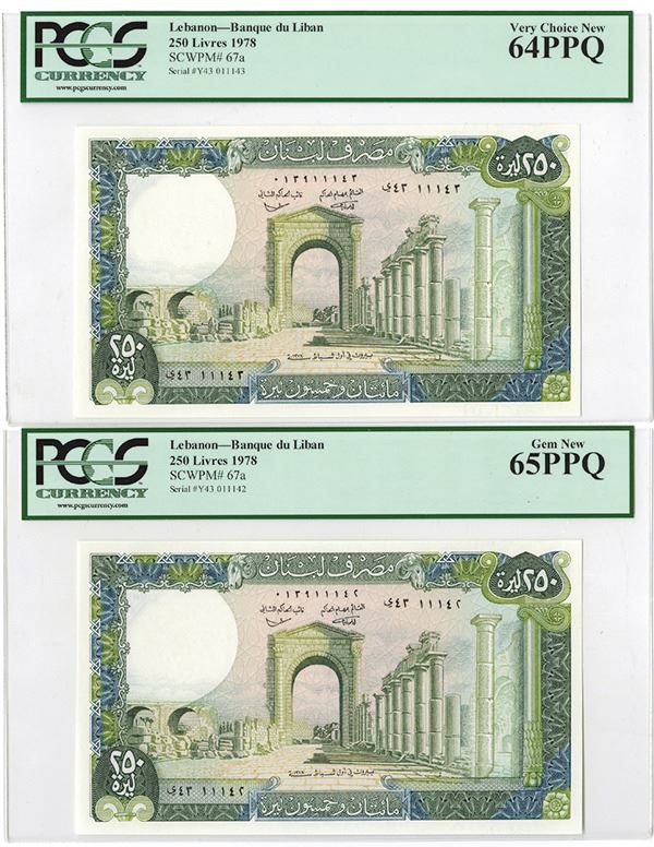 Lebanon, pair of 250 Livres, P-67a, serial number 011142-011143, PCGS graded Gem New 65 PPQ and Gem New 64 PPQ. TDLR.