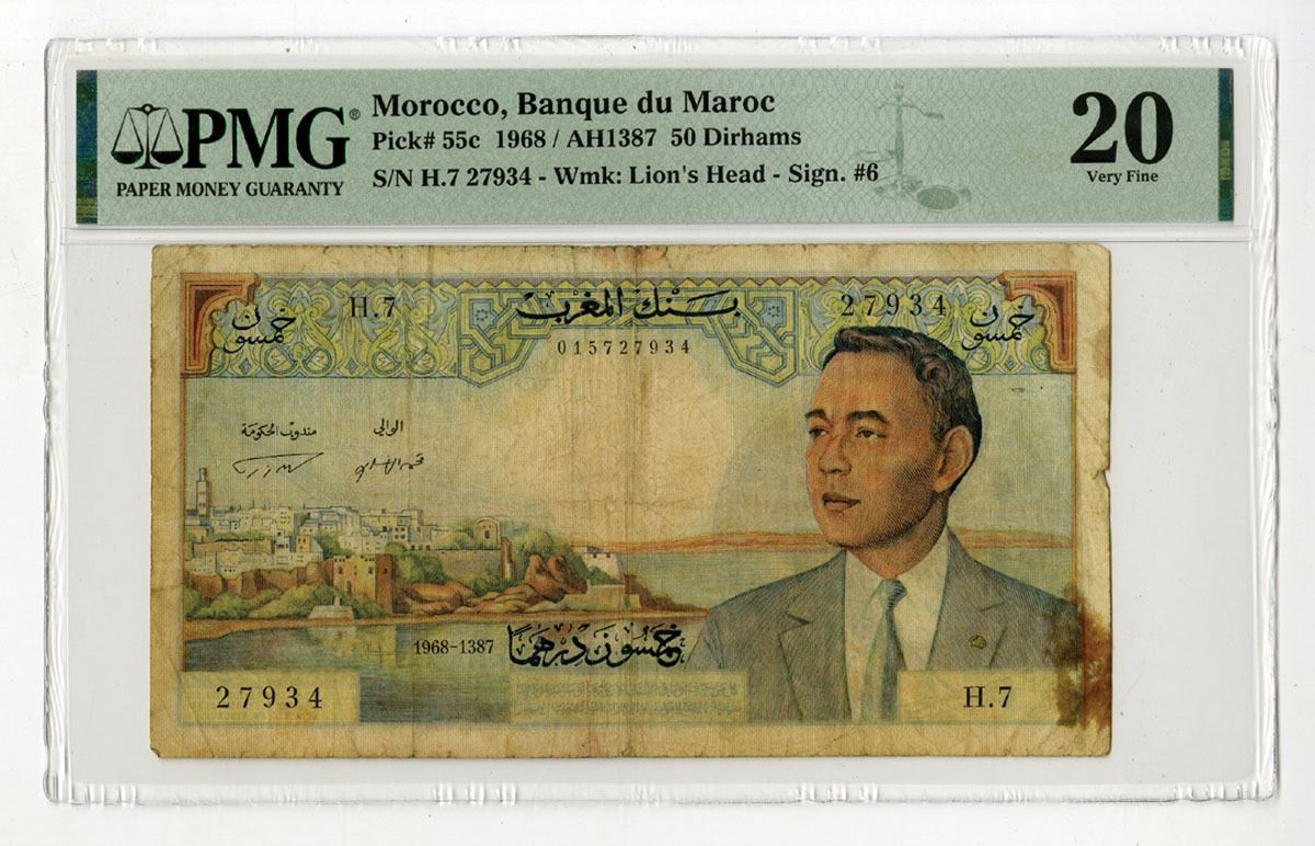 Morocco, 1968. 50 Dirhams, P-55c, Issued Banknote, Brown and m/c printing with King Hassan II at right, Back is blue and m/c with miners in mine and equipment at center, S/N H.7 27934, PMG graded Very Fine 20 with comment "Thinning," Printer: Banque de France.