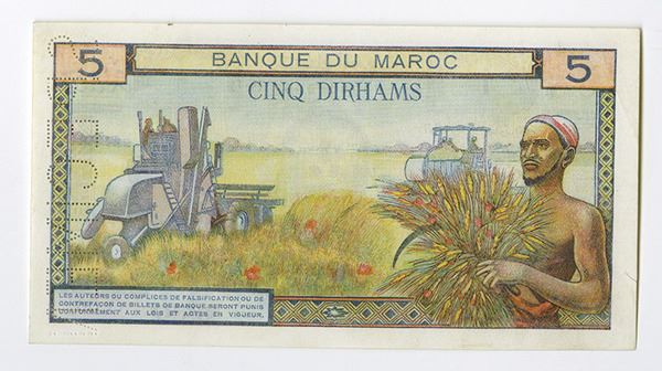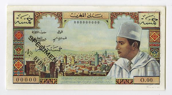 Morocco, specimen 5 Dirhams, P-53s, perforated and overprinted SPECIMEN No. 0198, S/N O.00 000000000, and not dated. Extra Fine with some staining and minor margin tear. Rare in this form.