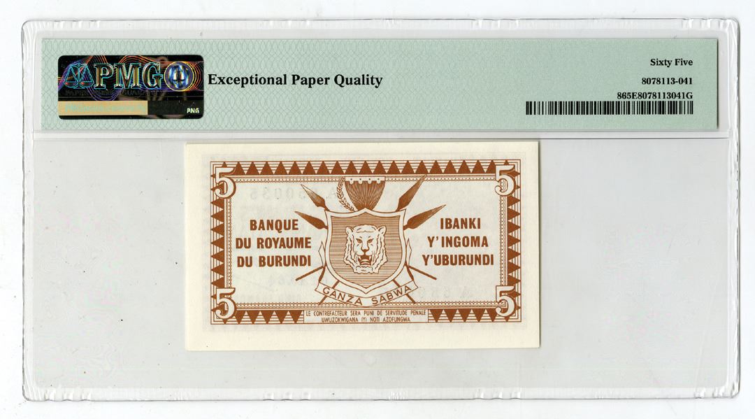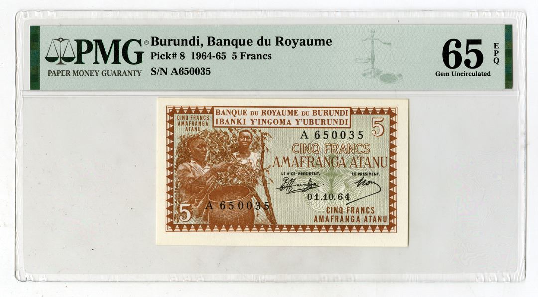 Burundi, 1964-65. 5 Francs, P-8, Issued Banknote, Light brown on gray-green underprint, Two young men picking coffee beans at left, S/N A650035, PMG graded Gem Uncirculated 65 EPQ.
