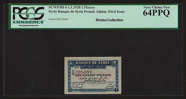 Syria, as French Protectorate, issued 1 Piastre from the first issue, 1920, P-6, attractive S/N 225599, graded Very Choice New 64 PPQ by PCGS and thus rare. BWC.