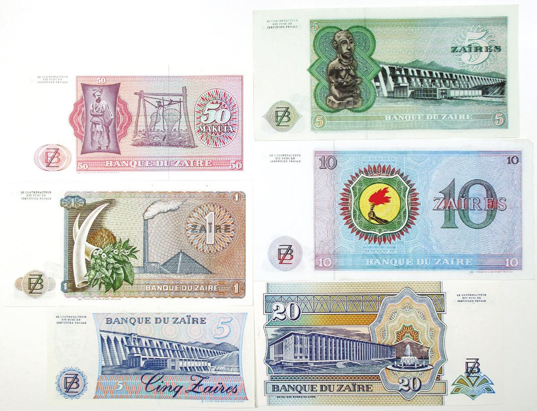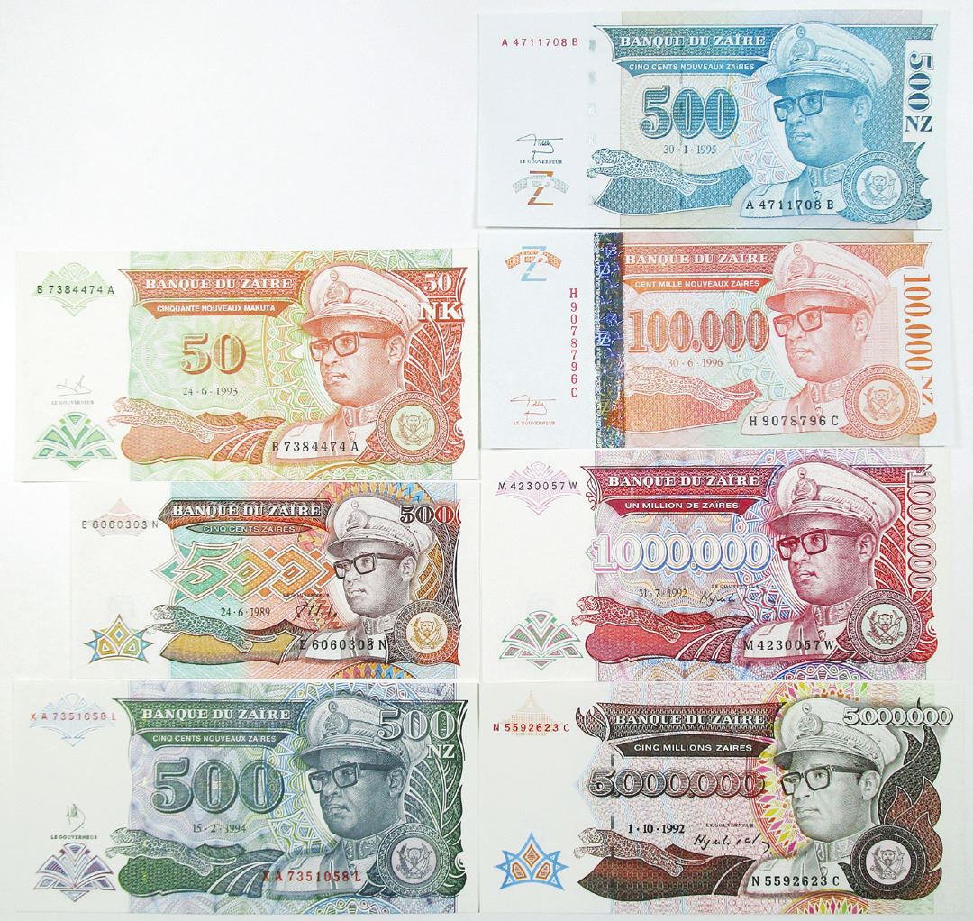 Zaire... 1977-1996. 50 Makuta, 1, 5, 10, 20, 50, 500, 100000, 1 Million, and 5 Million Zaires, P-17a; 18b; 21b; 23b; 26A; 34a; 44a; 46a; 56; 57; 64A; 65a; 76a, issued banknote group, Choice to Gem Unc (13).