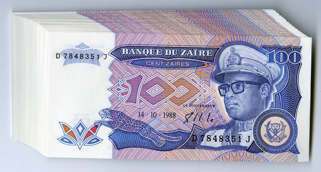 Zaire, 1988. Group of 25 Issued Banknotes, All Sequential S/Ns: 100 Zaires, P-33a, Blue and multicolor, Mobutu in military dress at right, leopard at lower left center facing left, arms at lower right, Watermark: Mobutu. Printer: HdMZ. Uncirculated. (25)