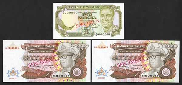 Zambia, 2 Kwacha, 1989, P-29s; and pair of Zaire 5000000 Zaires, 1992, P-46s, S/N 0000000 with consecutive specimen numbers 1327-8. Choice to Gem Uncirculated.