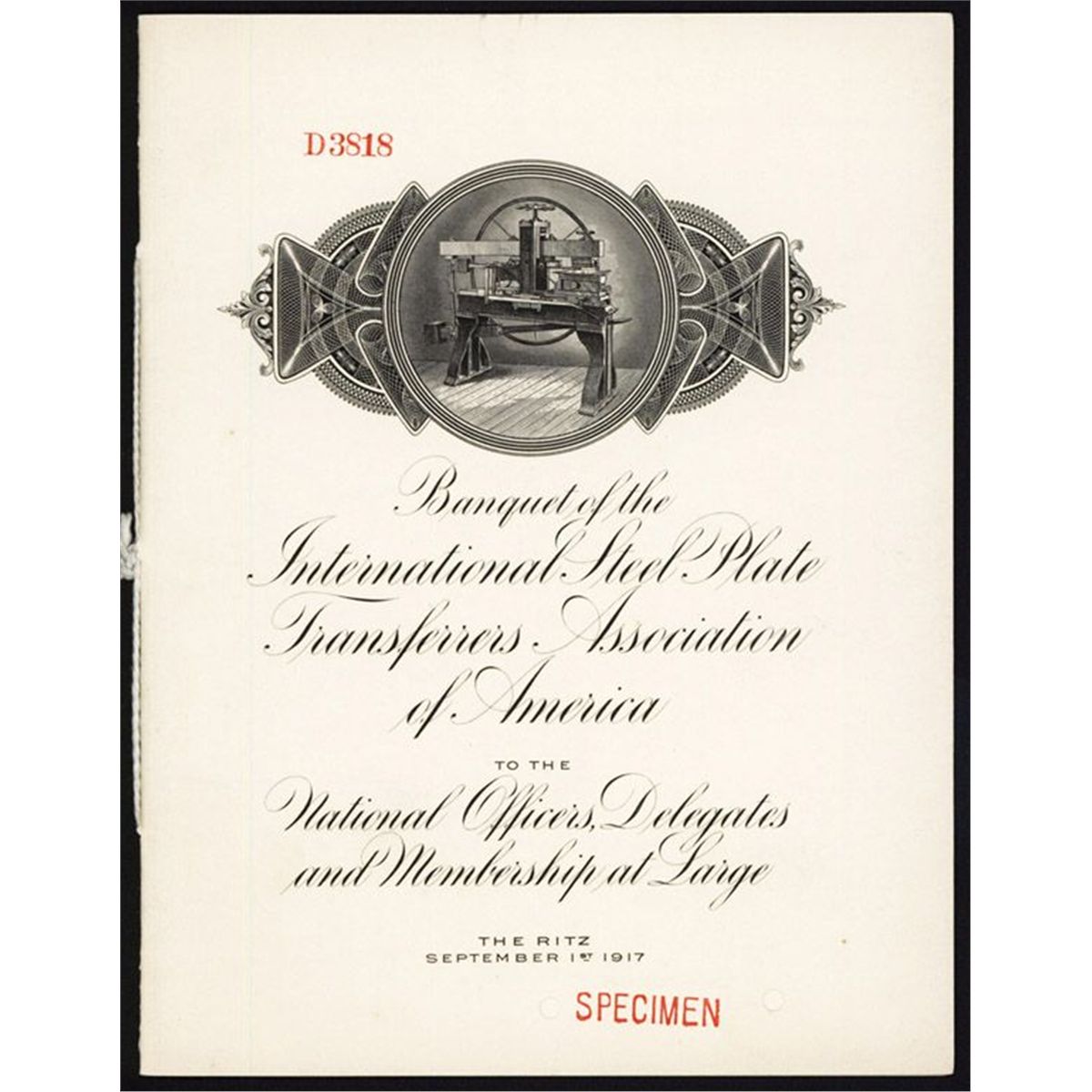 1917. To be held at the Ritz Hotel, Transfer equipment on top, inside has program and menu for banquet, Specimen overprint and purple rectangle RETURN TO ISSUE ROOM To be held for reference, POC's, XF condition. ABNC.