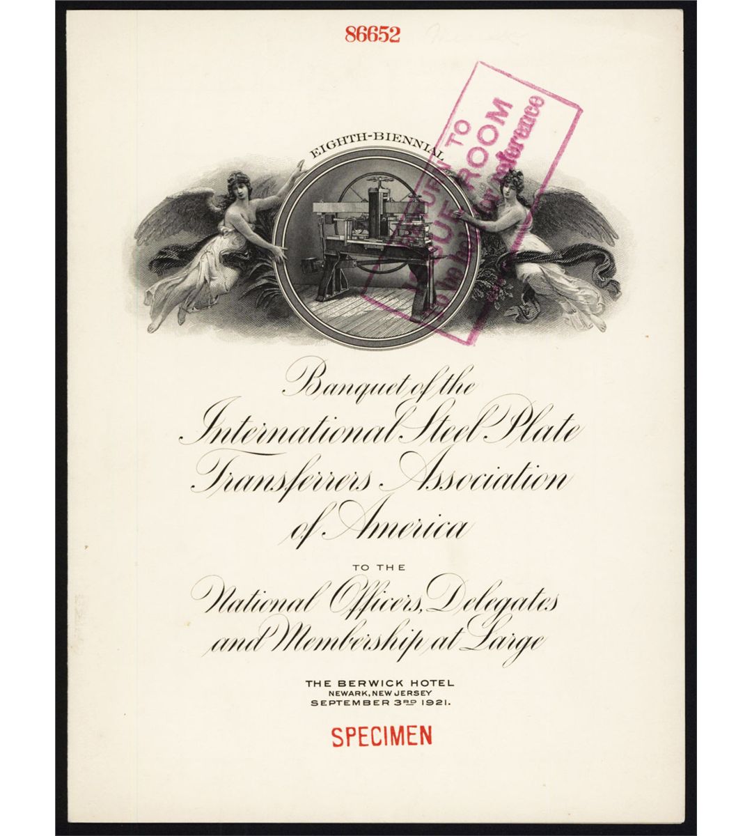 Newark, NJ. 1921 Specimen program and menu from their annual Banquet. Angels flank Transfer equipment on top, inside has program and menu for banquet, Specimen overprint and purple rectangle RETURN TO ISSUE ROOM To be held for reference, POC's, XF condition. ABNC.