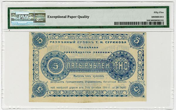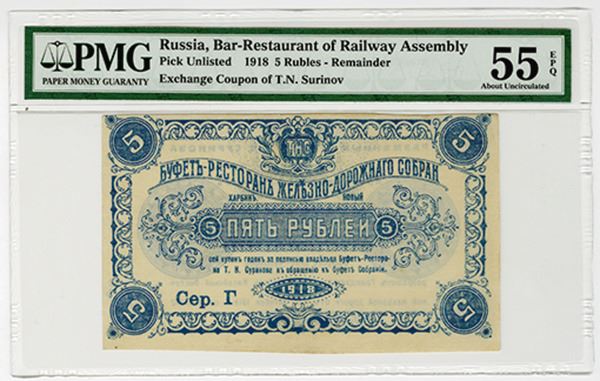 Russia. Remainder 5 Rubles, 1918, P-Unlisted. PMG graded About Unc 55 EPQ (Cert # 5003603-011).