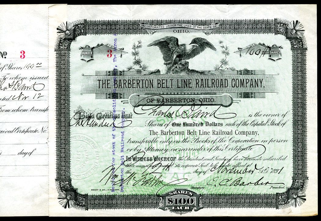 Barberton, Ohio, 100 Shares, I. Spread eagle on rock, VF-XF. Mount & Co.