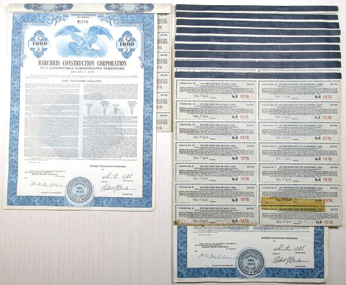 New York, 1961. Lot of 10 $1000 I/U 5 1/2% Convertible Subordinated Debenture Coupon Bonds, Black print with blue border and Bald Eagle at top, VF to XF condition, S-CBNC. Barchris Construction Corp. was involved in the business of constructing bowling alleys. The company filed a registration statement with the SEC for the issuance of convertible subordinated debentures. The registration statement was later found to contain material misstatements and omissions regarding the company's financial condition and business prospects. Barchris was then sued by investors and the court found that the defendants, including directors, officers, auditors, and underwriters, failed to exercise due diligence in ensuring the accuracy of the registration statement. Consequently, they were held liable for the misstatements and omissions. The case underscored the importance of accuracy and thoroughness in public securities offerings and set a precedent for the standards of due diligence required from corporate insiders and related parties. (10). Sold "AS IS" no returns accepted.