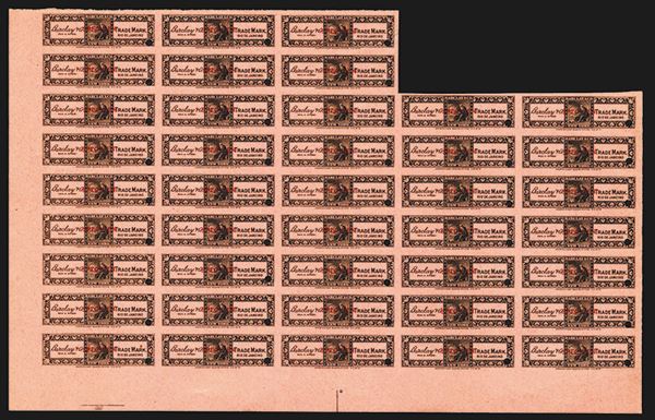 Barclay & Co. Partial sheet of 41 labels, POC and SPECIMEN on each. On rose paper.