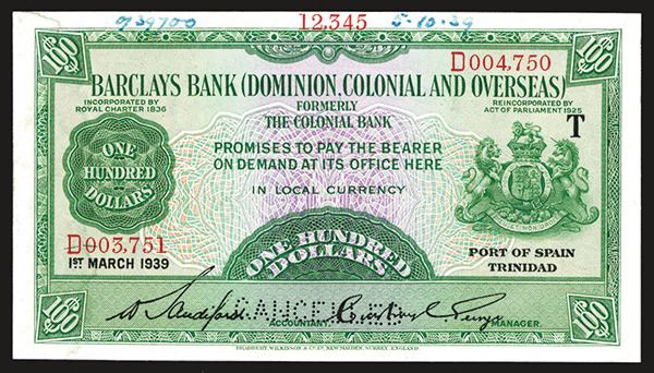 Port of Spain, Trinidad. $100, P-S104s, Specimen banknote, Green on m/c with arms at right, back green, purple and light blue, PMG graded Choice Uncirculated 64 NET with note of printer's annotations and previously lightly mounted, "T" overprint on top right of the face, 2 signatures, pin punch specimen, S/N D003,751 - 12,345. Rare note in any form or condition. BWC.