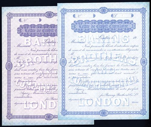London, England. 19xx (ca.1900-1910), Lot of 2 different colored Circular Letter of Credits, one purple and the second blue with Baring Brothers underprint, Similar to a Traveler's Check. Payable in “Pounds”, Pin-punch “SPECIMEN - C.Skipper & East” and POC's, XF to AU condition. S&E. Barings Bank, established in 1762, was the oldest merchant bank in London until its collapse in 1995 after one of the bank's employees, Nick Leeson, lost $1.3 billion due to speculative investing, primarily in futures contracts, at the bank's Singapore office.