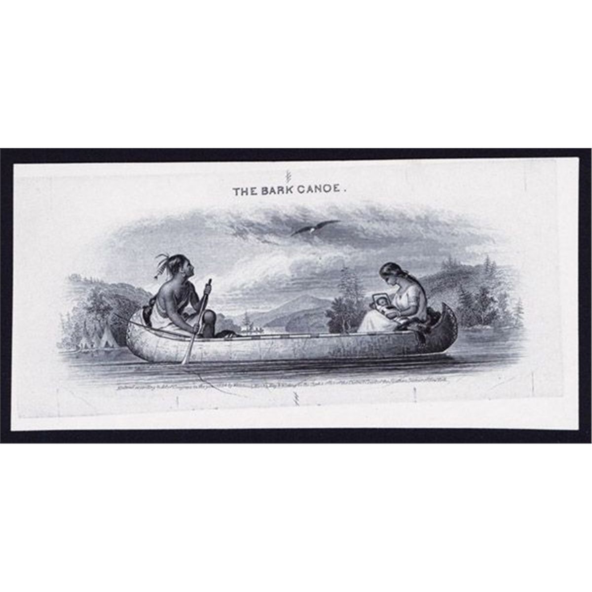 New York, 1854, Proof portrait of Native American family in canoe with Teepees and mountains in background and bird above. Engraved by Wellstood, Hanks, Hay & Whiting. Printed in black on india paper. Vignette used on Holliston Bank, Choice Uncirculated, 1854, $100, MA690-G16. WHHW.