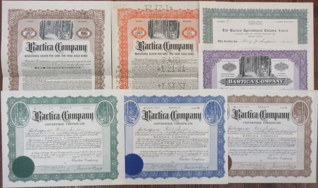 British Guiana (Inc. in Maine). Group of 5 Stocks and 2 Bonds that are I/U. All are in VF-XF condition. 7 Pieces. The Bartica Company was a land company that dealt with the rubber tree plant in South America. (7)