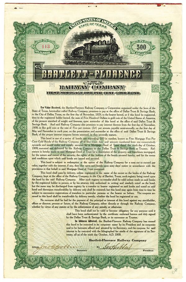 Texas. $500 5% 1st Mortgage Gold Coupon Bond, Black print on green border and under tint, Locomotive in profile at top, Fine-VF condition with splitting along fold lines, Dorsey-Litho.