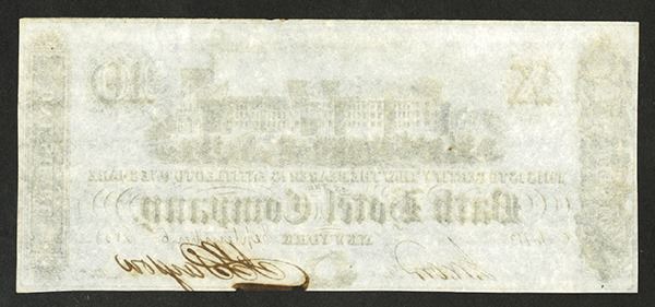 New York, $10 = 1 Share, I/U, Black printing, AU - Uncirculated, Impressive hotel in middle, S/N 113, Scarce issued. Possibly used a currency for the hotel.