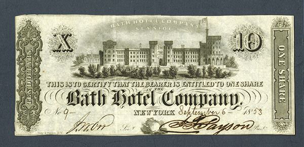 New York. Obsolete Banknote Look-a-like, 1 Share Certificate made to look like a $10 bill. Castle-like building view across top. Doty & Bergen imprint. Issued, XF+.