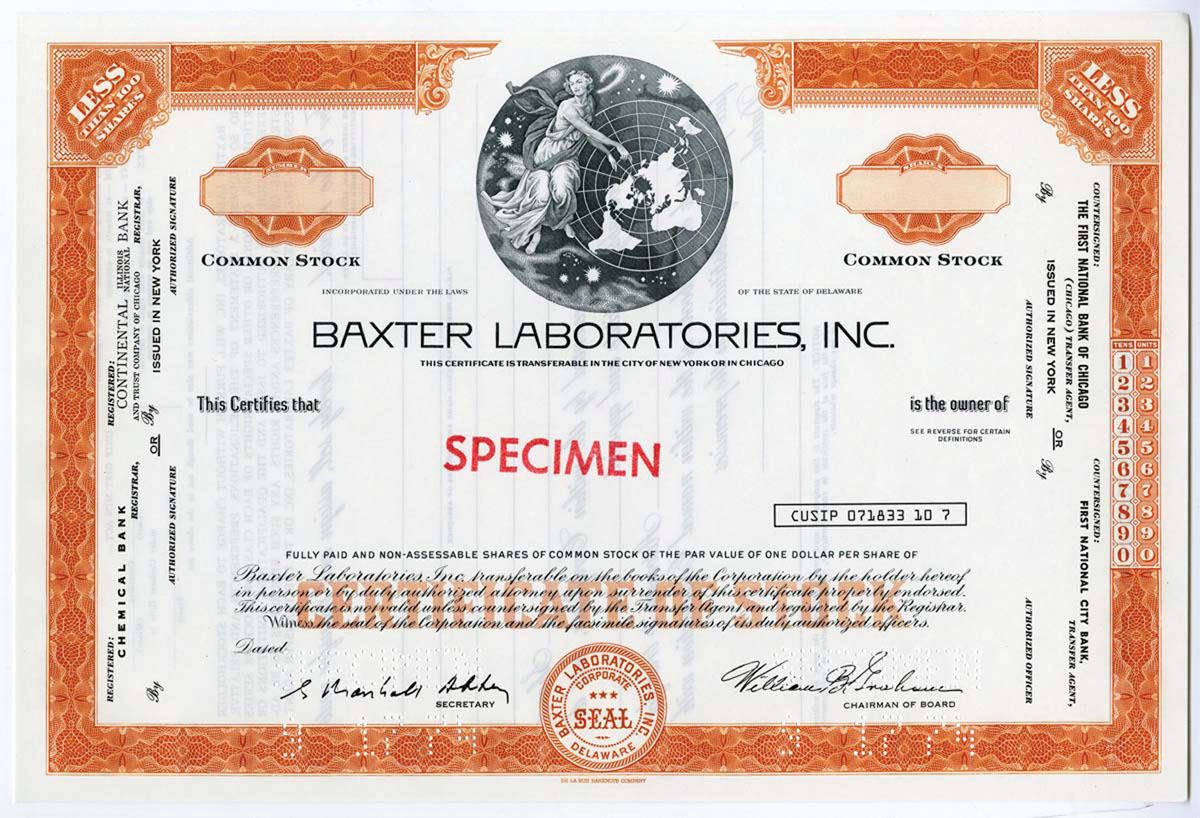Baxter Laboratories, Inc, 1974 <100 Shrs Specimen Stock Cert., VF-XF Orange. In 1931, physicians Donald Baxter of Los Angeles and Ralph Falk of Boise, Idaho, started the Don Baxter Intravenous Products Corp., which made supplies for IV systems in hospitals. In 1933, Baxter started a manufacturing plant in Glenview. A pioneer in blood preservation methods as well as IV supplies, Baxter grew steadily. In 1947, it moved its headquarters to Morton Grove; the company soon employed over 500 people in the Chicago area. Annual sales grew from about $10 million in the mid-1950s to more than $100 million by 1967, when the company was making dialysis equipment, heart-lung machines, and many other equipment items for hospitals. In 1975, when it employed about 2,200 in the Chicago area, the company moved its headquarters to suburban Glenview; the following year, its name changed to Baxter Travenol Laboratories. The company grew rapidly thereafter.