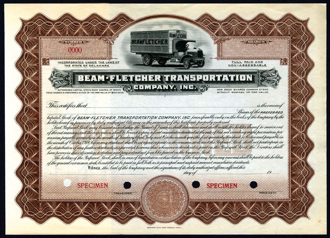 Odd Shares, Specimen stock certificate. Red "Specimen" overprints, "00000" serial numbers and POC's. Brown border with early truck vignette. Choice uncirculated.