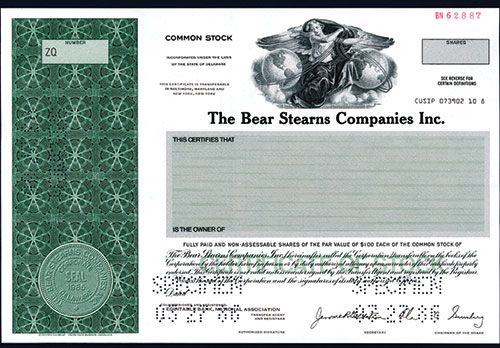 Delaware, 1986, Specimen Stock, Odd Shares, Black on green border and underprint, Allegorical woman holding wires and flanked by two globes top center, VF-XF condition, SC-USBNC. Facsimile of Alan C. Greenberg Chairman of the Board from 1985-2001.