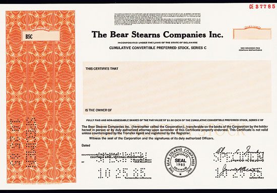 Delaware, 1985, Specimen Stock, Black on orange border and underprint, Preferred stock from their IPO, VF-XF condition, SCBNC.