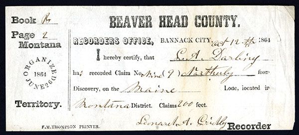 Bannack City, MT October 12th, 1864, (Montana became a Territory in June of 1864), Issued mining claim for “Maine Lode located in Montana District “200 Feet”, Leonard A. Gridley, Recorder, VF condition with small pin hole on upper right, Early Montana Territory mining claim. As an added attraction, a S.L. Clemens forgery signature was placed on the back of this authentic mining claim with note in pencil that this is a “Eugene Field II - Forgery”. Interesting.