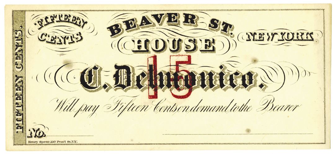 New York, NY. 1840-60's, Unissued 15 Cents scrip note issued by C. Delmonico, who was Charles "Old Charlie" Constant Delmonico. Delmonico's at Beaver St. House is the name of a restaurant that gained a reputation as one of the nation's top fine dining establishments. The birthplace of the widely imitated Delmonico steak, the restaurant is credited with being one of the first American restaurants to allow patrons to order from a menu ˆ la carte, as opposed to table d'h™te. It is also said to be the first to employ a separate wine list. . About Unc with spots.