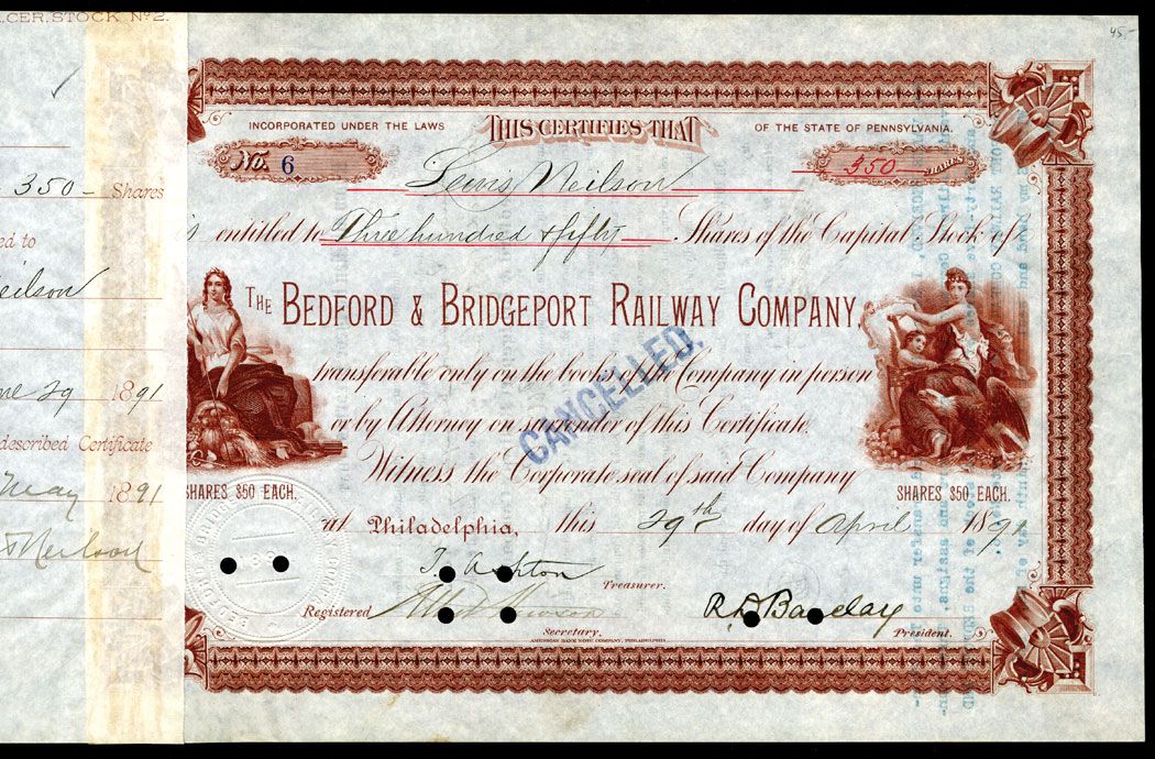 Philadelphia, Pennsylvania, 350 Shares, I/C, brown printing, allegorical woman on left and Liberty with eagle and cherub on right, VF.