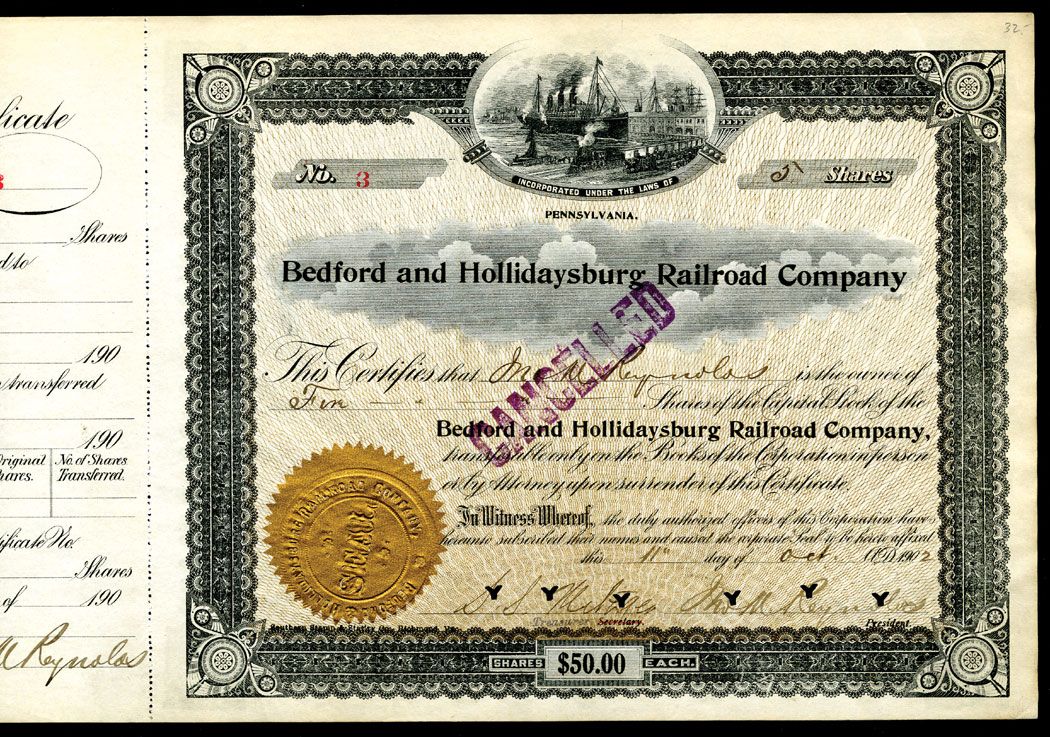 Pennsylvania, 5 Shares, I/C, locomotives at wharf on top, counterfoil on left. Southern Stamp and Stationary.